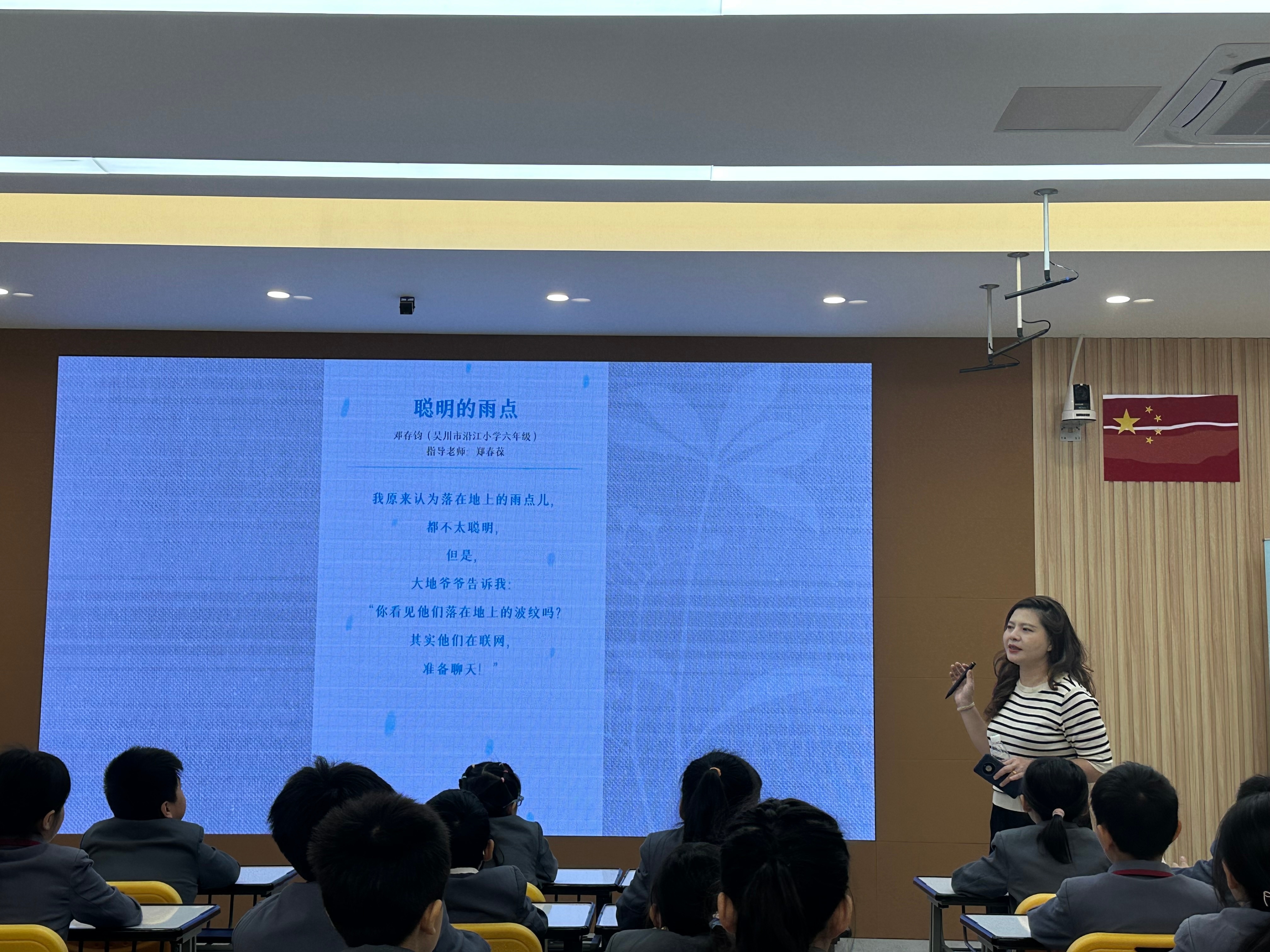 活动中,郭珊老师用亲切的语言与孩子们互动,拉近与孩子们的距离,让学生感受到诗歌就在身边。同时,郭珊老师为孩子们展示并讲解了获奖的儿童诗歌,通过用生活中的例子和抓住孩子们的兴趣点,让孩子们学会留意生活,捕捉灵感萌发的瞬间,转换思维,放飞童真与想象力,表达自己内心的真情实意,鼓励孩子们大胆创作。