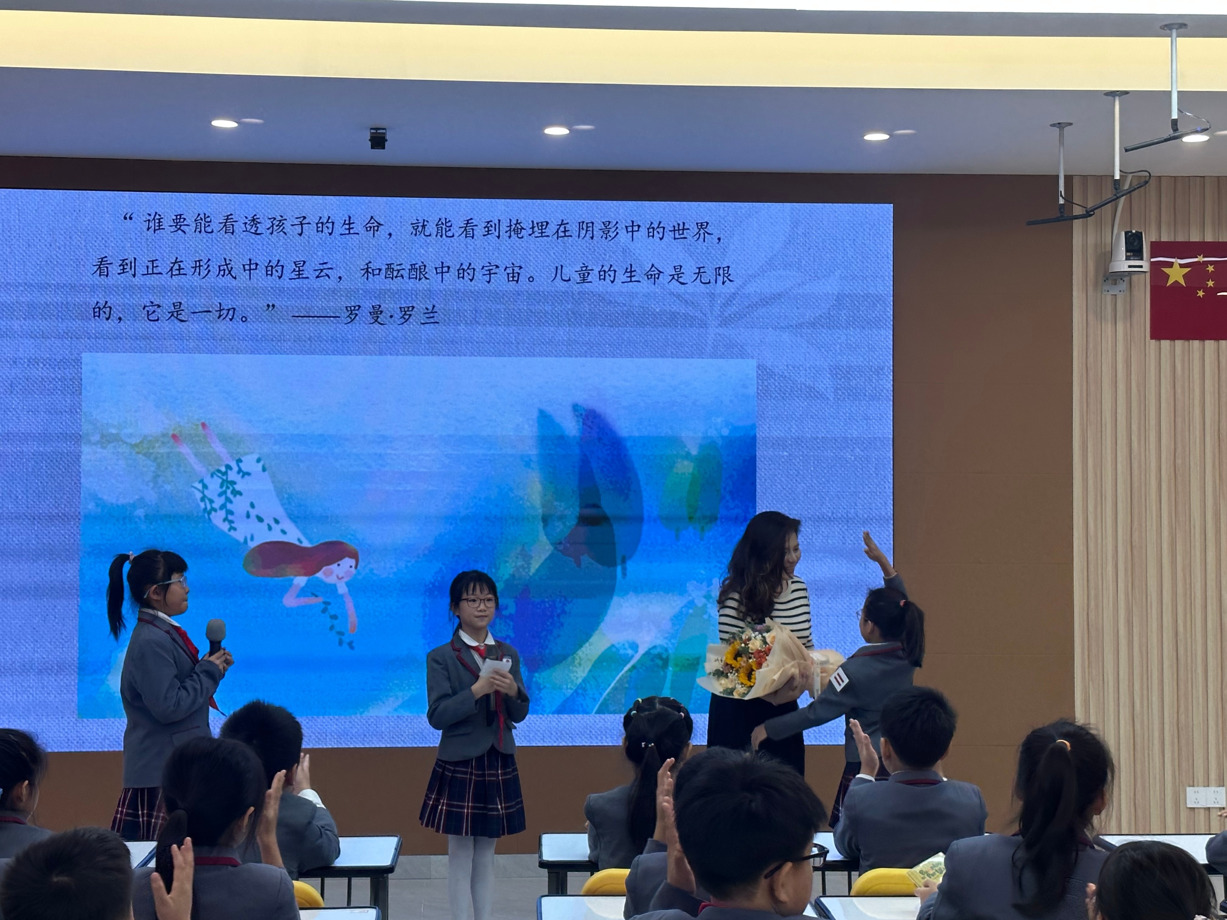 最后,为了表达学校的感谢与敬意,少先队员黎奕涵为郭珊老师献花,并且全体师生与郭珊老师合影留念。