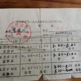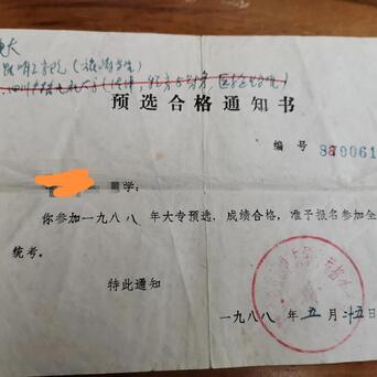 【1988年高考有多难?你可能连参考资格都没有】整理书架,翻出了1988年高考准考证,还有高考预选合格通知书等,不禁让人感慨万千。当时不是只要读了高中就可以参加高考,参加高考需要通过高考预选考试,没有通过预选,高考报名资格都没有。预选一般比高考提前一个月举行。经过预选选拔,有幸能走进高考考场的只是少数,而最终能走进大学成为天之骄子的,更是少之又少。大多数都是无缘高考。